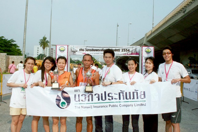นายศรัณฐ์ หวั่งหลี ผู้จัดการแผนกบริหารพัฒนาธุรกิจ บริษัท นวกิจประกันภัย จํากัด (มหาชน) และพนักงาน ให้การสนับสนุนและร่วมกิจกรรม "เดิน-วิ่ง เฉลิมพระเกียรติ วันจักรี 2554 (ครั้งที่ 2)” เพื่อรําลึกถึงพระมหากษัตริย์ไทยในราชวงศ์จักรี และ เฉลิมพระเกียรติพระบาทสมเด็จพระเจ้าอยู่หัว ในวโรกาสทรงเจริญพระชนมพรรษา 84 พรรษา พร้อมมอบรางวัลแก่ผู้ชนะในการแข่งขัน