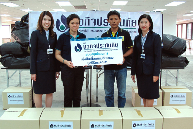 นางสาวจารุวรรณ จับจำรูญ ผู้อำนวยการฝ่ายธุรการ บริษัท นวกิจประกันภัย จำกัด (มหาชน) พร้อมตัวแทนพนักงานร่วมส่งมอบเครื่องแบบพนักงานหญิงชุดเก่า เสื้อผ้าทั่วไป และของเล่นเด็ก สนับสนุน โครงการแบ่งปันเพื่อการเปลี่ยนแปลง มูลนิธิกระจกเงา เพื่อนำไปบริจาคและจำหน่ายเพื่อนำเงินสมทบกองทุนพัฒนาชุมชนที่ขาดแคลนและค่ายผู้อพยพทั่วประเทศ ในโอกาสที่บริษัทฯ เปลี่ยนเครื่องแบบพนักงานหญิงใหม่