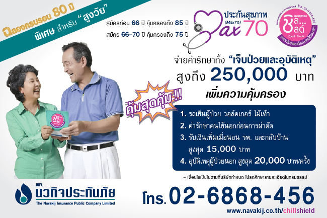 นวกิจประกันภัย ฉลองดำเนินธุรกิจประกันภัยครบรอบ 80 ปี ส่ง “แผนประกันสุขภาพ Max 70” คืนกำไรให้กลุ่มผู้สูงอายุตั้งแต่ 51-70 ปี กรณีสมัครก่อน 66 ปี ต่ออายุได้ถึง 85 ปี อายุ 66-70 ปี ต่ออายุได้ถึง 75 ปี ด้วยวงเงินเบิกค่ารักษาพยาบาลทั้งจากโรคภัยไข้เจ็บและอุบัติเหตุ สูงถึง 250,000 บาท มีให้เลือกทั้งการรักษาแบบผู้ป่วยในและผู้ป่วยนอก เพี่อพร้อมรับมือกับความเสี่ยงต่อโรคเมื่อมีอายุมากขึ้น เพิ่มความอุ่นใจและคลายความกังวลในเรื่องค่าใช้จ่ายในการรักษาพยาบาลที่สูงขึ้นเรื่อยๆ ทุกปี