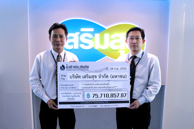 นายสมบูรณ์ นภาแจ่มจันทร์ รองผู้อำนวยการฝ่ายการตลาด บริษัท นวกิจประกันภัย จำกัด (มหาชน) มอบค่าสินไหมทดแทนกรมธรรม์ประกันความเสี่ยงภัยทรัพย์สิน จำนวนเงิน 75,710,857.87 บาท แก่ นายพีรศิษย์ ขาวคำ ผู้จัดการแผนกการเงิน บริษัท เสริมสุข จำกัด (มหาชน) ซึ่งโรงงานผลิต คลังสินค้า และสำนักงาน ในเขตพื้นที่จังหวัดภาคกลางได้รับความเสียหายจากเหตุการณ์มหาอุทกภัย เมื่อวันที่ 28 กันยายน ที่ผ่านมา