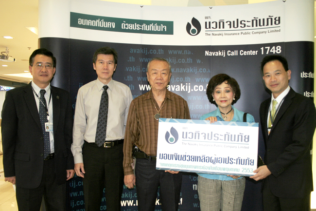 นายปิติพงศ์ พิศาลบุตร กรรมการผู้อำนวยการ นายอดุล พัฒนะภูมิ ผู้ช่วยกรรมการผู้อำนวยการ และนายวัลลภ กันฉาย รองผู้อำนวยการฝ่ายสินไหมทดแทน บริษัท นวกิจประกันภัย จำกัด (มหาชน) มอบเงินช่วยเหลือผู้เอาประกันภัยจากเหตุการณ์ชุมนุมทางการเมืองในเดือนพฤษภาคม 2553 กรณีกรมธรรม์ประกันภัยไม่ได้คุ้มครองความเสียหายจากเหตุการณ์ดังกล่าว แก่ นายวินัย ทรัพย์มารวย และนางอรัญญา ทรัพย์มารวย หนึ่งในกลุ่มลูกค้ารายย่อย ซึ่งเป็นผู้ประกอบการธุรกิจบริเวณศูนย์การค้า เซ็นทรัล เวิลด์ ผู้ทำประกันอัคคีภัย กับ บมจ. นวกิจประกันภัย และได้รับความเสียหายจากเหตุการณ์ดังกล่าว ทั้งนี้เป็นไปตามนโยบายบริษัทฯ ที่ต้องการมอบความช่วยเหลืออย่างเร่งด่วนแก่ลูกค้า เมื่อเร็วๆ นี้