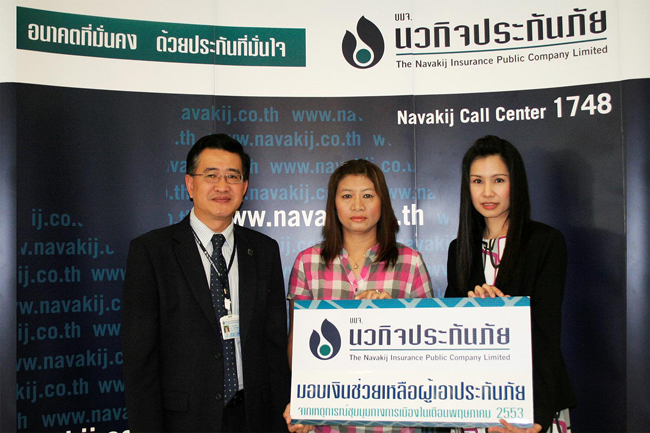 นางนลินา โพธารามิก ผู้ช่วยกรรมการผู้อำนวยการ และ นายวัลลภ กันฉาย รองผู้อำนวยการฝ่ายสินไหมทดแทน บริษัท นวกิจประกันภัย จำกัด (มหาชน) มอบเงินช่วยเหลือ นางสิริลักษณ์ อุ่นสากล หนึ่งในกลุ่มลูกค้าประกันอัคคีภัย ผู้ประกอบธุรกิจรายย่อยบริเวณศูนย์การค้าเซ็นเตอร์วัน (Center One) ซึ่งได้รับความเสียหายอย่างหนักจากเหตุการณ์ชุมนุมทางการเมืองในเดือนพฤษภาคม 2553 ตามนโยบายบริษัทฯ ที่เร่งให้ความช่วยเหลือลูกค้าในกรณีกรมธรรม์ไม่ได้คุ้มครองความเสียหาย เมื่อเร็วๆ นี้